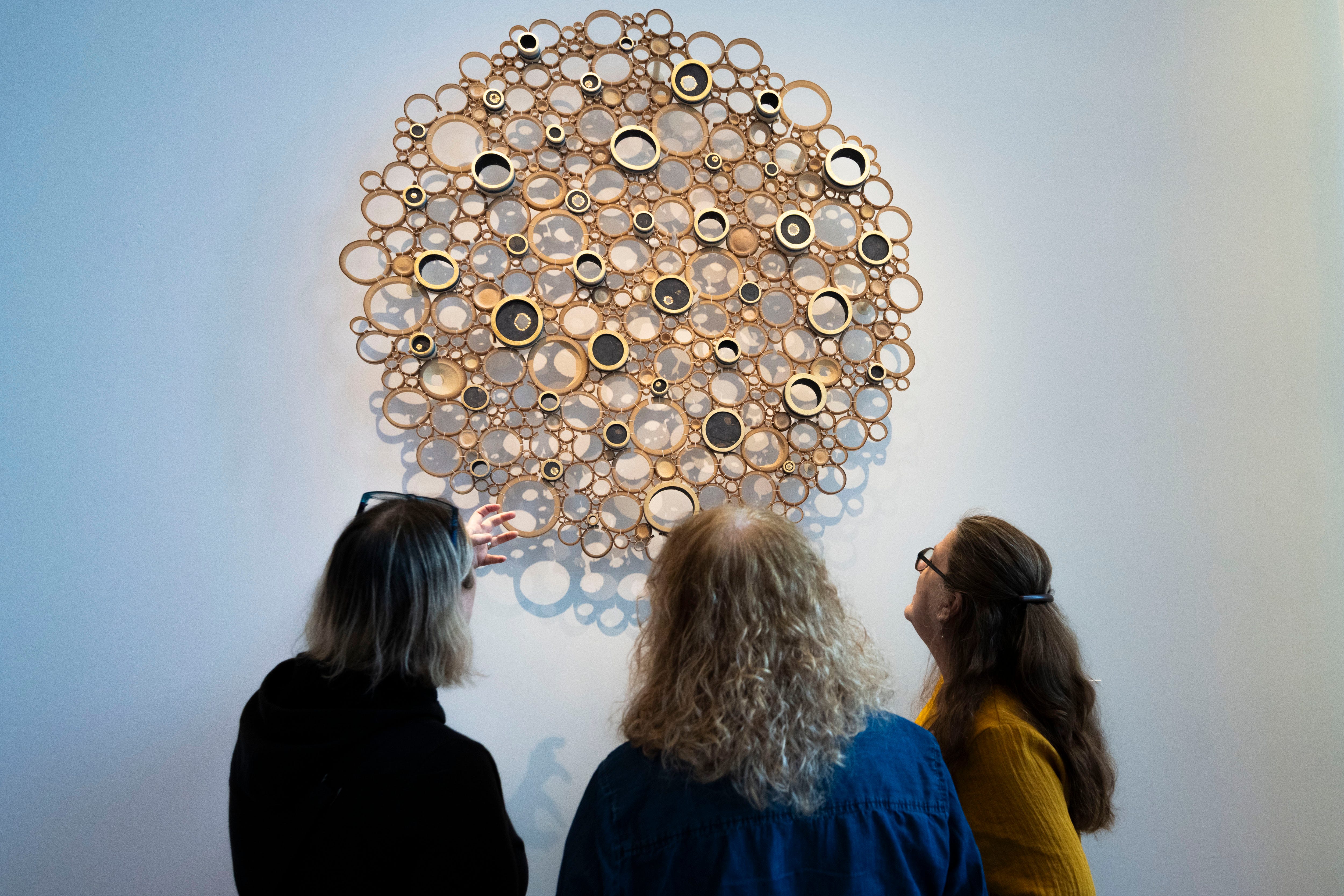 Anne Crumpacker’s piece called “Shine a Light” has a lot going on. It seems to just float weightlessly off the museum wall. And little wonder: Crumpacker’s materials are thin sections of bamboo, waxed-linen thread, Korean rice paper and gold leaf. Nothing that weighs anything.