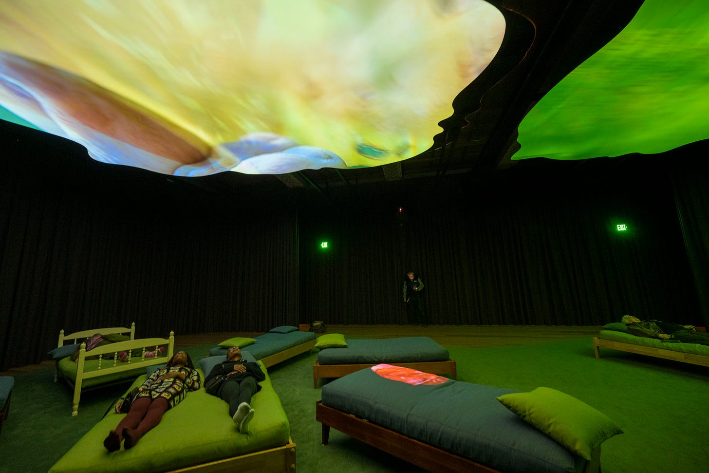 After Leonardo DaVinci’s “Mona Lisa,” Claude Monet’s “Water Lilies” is one of the famous painting series of all time. This remarkable new installation at the PAM invites visitors to slip off their shoes, lie down on raft-like beds and gaze upward—as though they are floating underwater in Monet’s garden, and looking at those famed lilies from underneath. This installation by Swiss video and installation artist Pipilotti Rist includes moving imagery, film shot underwater and a dreamy soundtrack. The artist’s statement? She would like her installation to “simulate our dissolution into water, mud, slime, molecules and atoms.” In addition to all that, it’s fun just to lie there and look up.