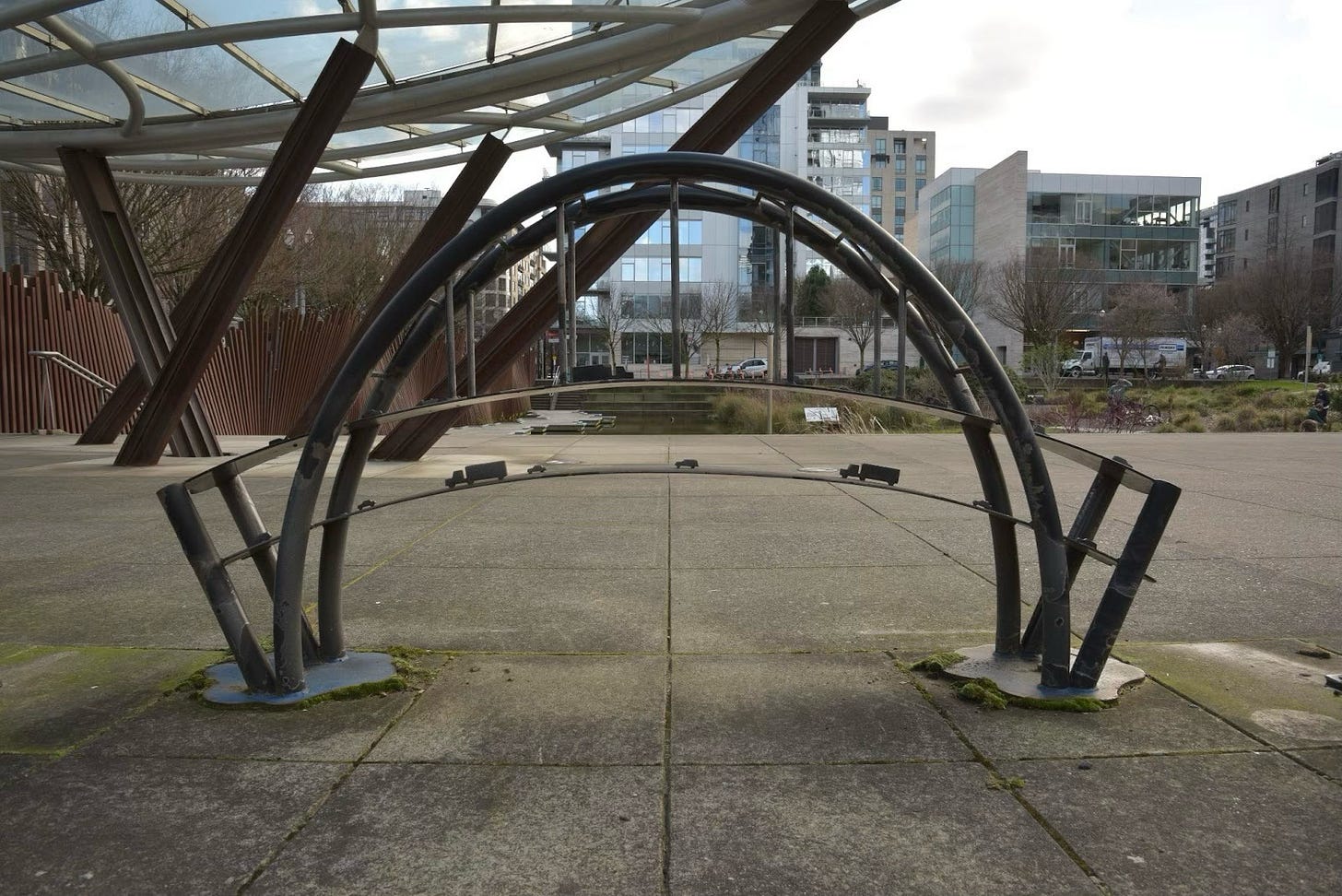 Originally, there were five Fremont Bridge bike racks, but one has since been removed. They were installed throughout the Pearl District as part of a revitalization project in about 2001.