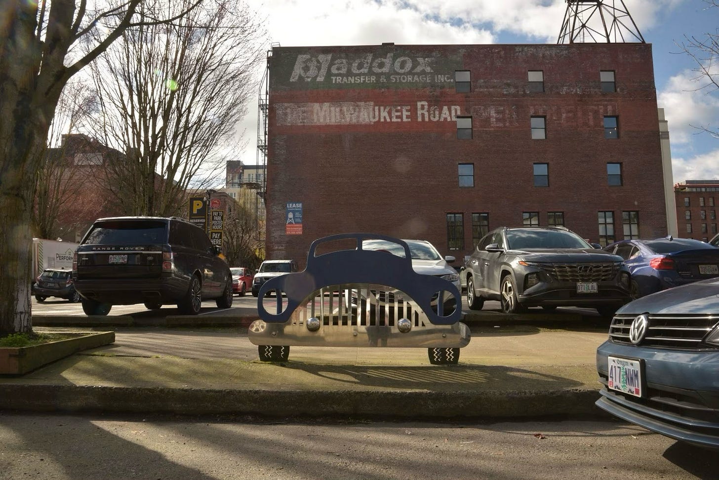 The Cool Car bike rack is located on Northwest 12th and Hoyt.