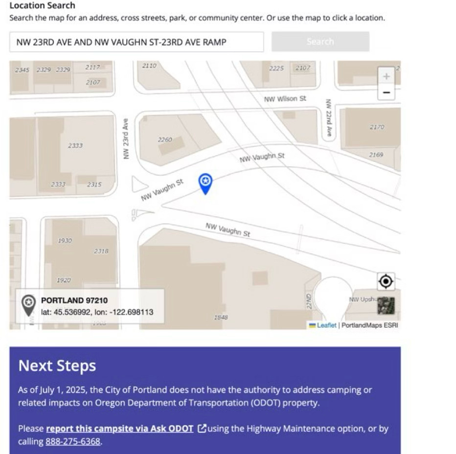 Online complaints of nuisances under the freeway have been greeted by notice that “As of July 1, 2025, the City of Portland does not have the authority to address camping or related impacts on Oregon Department of Transportation property. Please report this campsite via ODOT.”
