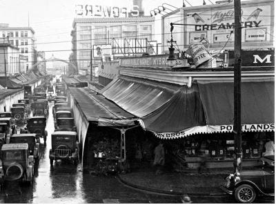 The young Grubmeyer later shortened his name to Fred G. Meyer and became one of the primary operators of the Carroll Public Market that on Portland’s Southwest Yamhill Street. Meyer ran some stalls himself under sidewalk tarps and leased stalls to others between SW First and Fifth Avenues. From its beginning in 1914 with the city government’s approval, the market was a success. Alas, the rise of the automobile put increasing pressure on use of Yamhill Street and City Hall came up with a new plan.