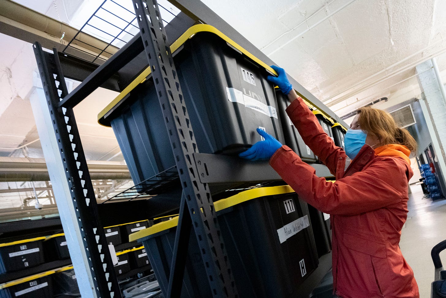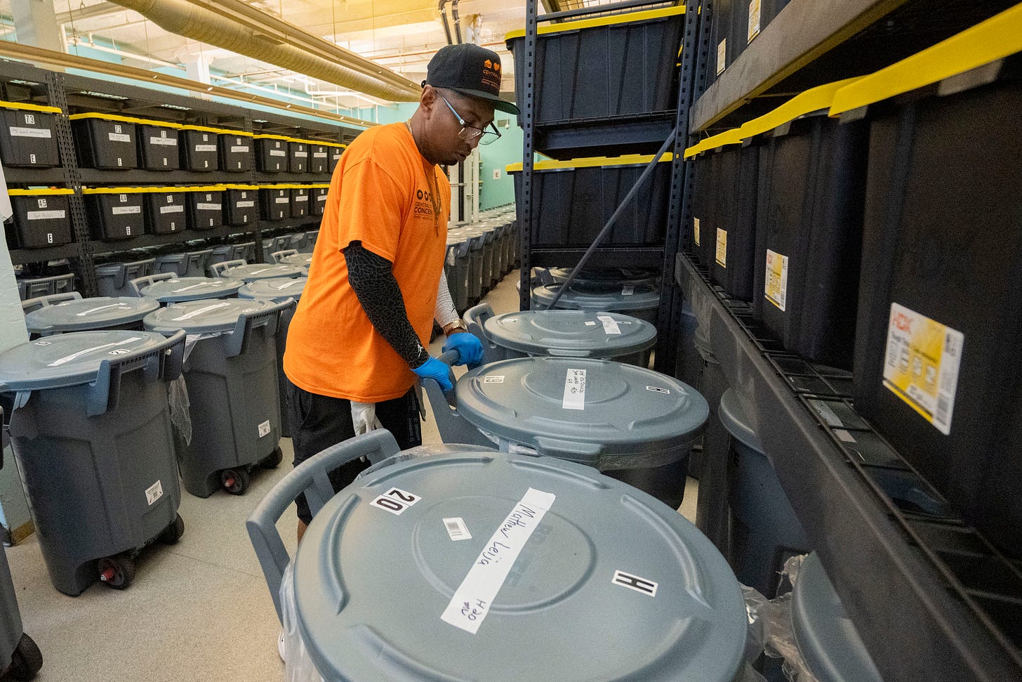 The Day Storage facility includes 490 storage bins — both 32-gallon plastic drums and 27-gallon tubs — which customers can access from 7 a.m. to 8 p.m. up to three times every day. The storage area is locked and staffers bring customers’ bins out to a waiting area, where each person is allowed up to 15 minutes at a time to deposit or retrieve his or her belongings. No weapons, food or drugs are allowed. Anything left unclaimed after 30 days is discarded. The place is now at full capacity, with a waiting list growing by the day.