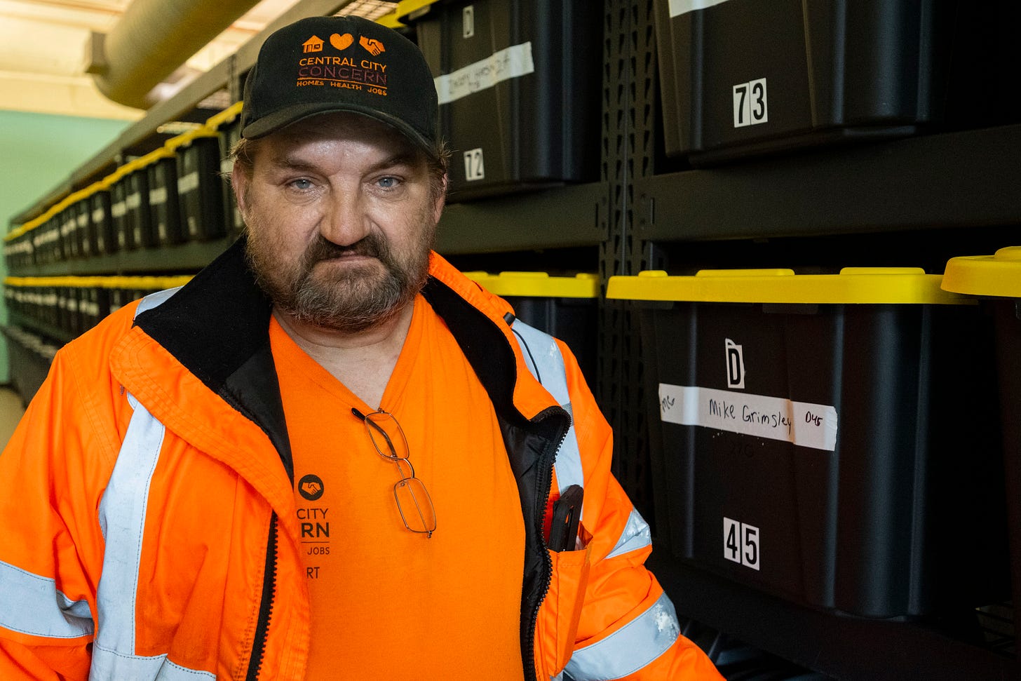 Jessie Fosse had been unhoused for more than 11 years. He has been working at Central City Concern for five years, all of them with the Day Storage Program. All of the employees that Jessie supervises were at one time homeless themselves. Employees must go through training, pass background checks and a drug screening test.