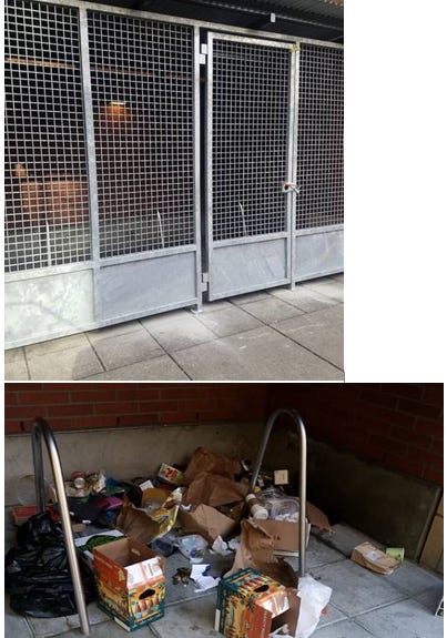 A year or two ago when this problem was first publicized, I suggested that the "public" bicycle parking be installed nearer the curb in the street tree zone of the sidewalk, in order to fulfill the requirement for public access. Then the building alcoves could be secured and repurposed, perhaps as storage.
