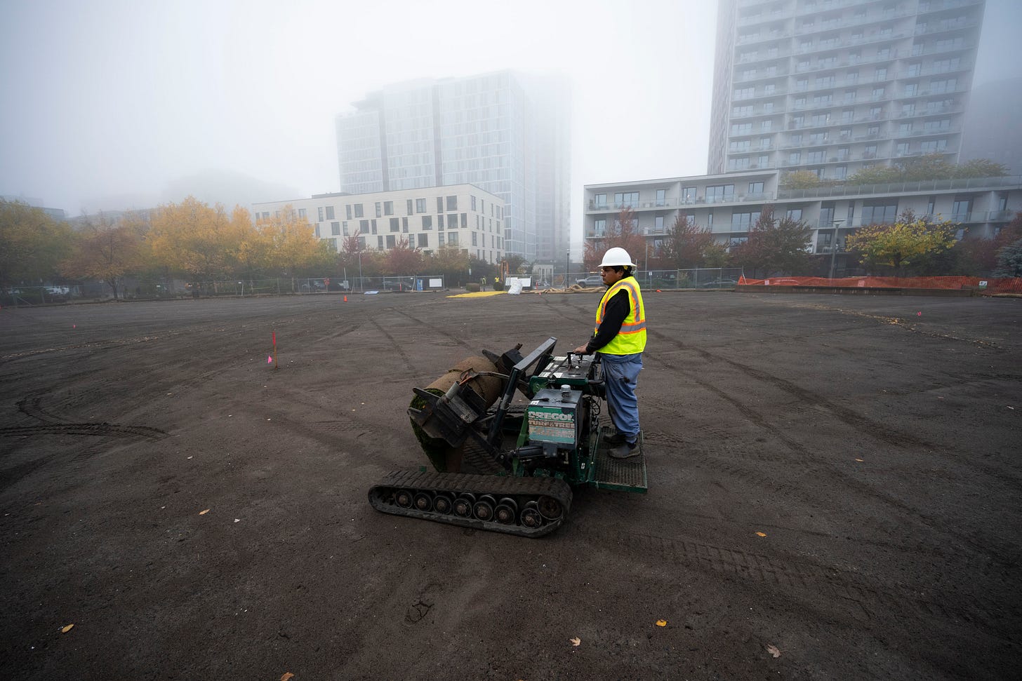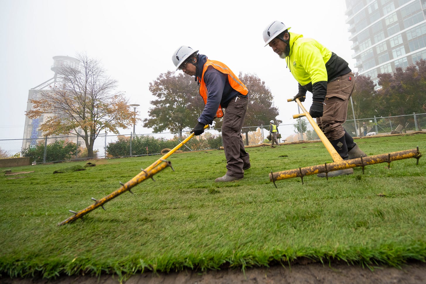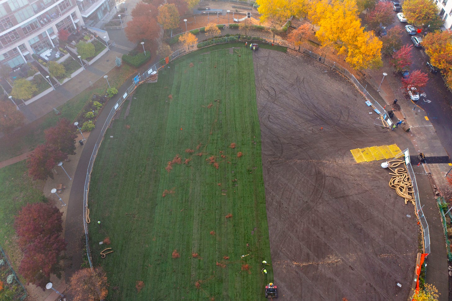 Wednesday morning before dawn, the first crews arrived to start laying more than 3 acres of perennial rye grass sod on the park that’s been cyclone-fenced off and an active construction zone for almost two years. Why? This is a PacifiCorp project, and the power company needed to bury its cables that have been carrying power perfectly well for multiple decades sitting in muck on the bottom of the Willamette River.