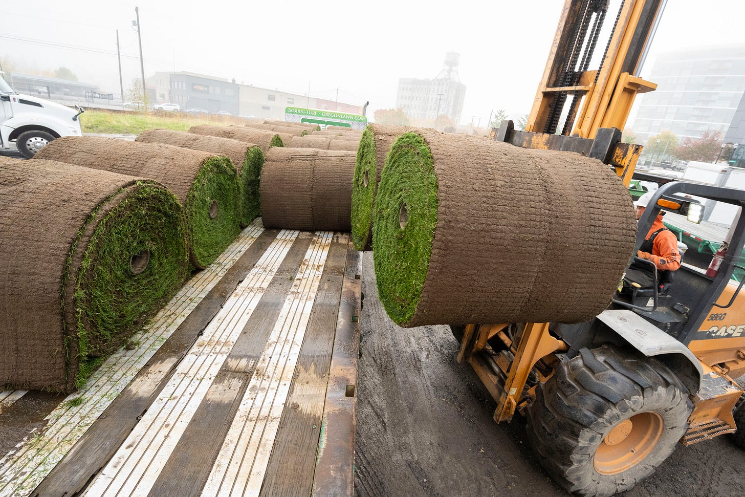 Which brings us to today, and the arrival of the first of half a dozen flatbed trucks bearing huge 1-ton rolls of rye grass—144 rolls of sod in all—freshly harvested within the last 24 hours from Oregon Turf and Tree Farms in Hubbard. The work began early Wednesday and will wrap up on Thursday. We’ll all have another relatively short wait, about four weeks, for the sod to take root. Then, that forbidding fence will come down. And dogs (on leash) and their humans will be free again to cavort in Fields to their heart’s content.