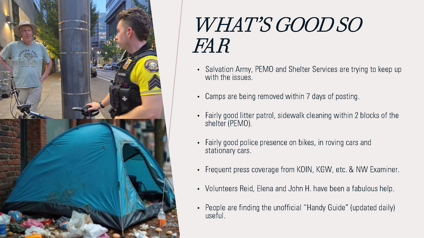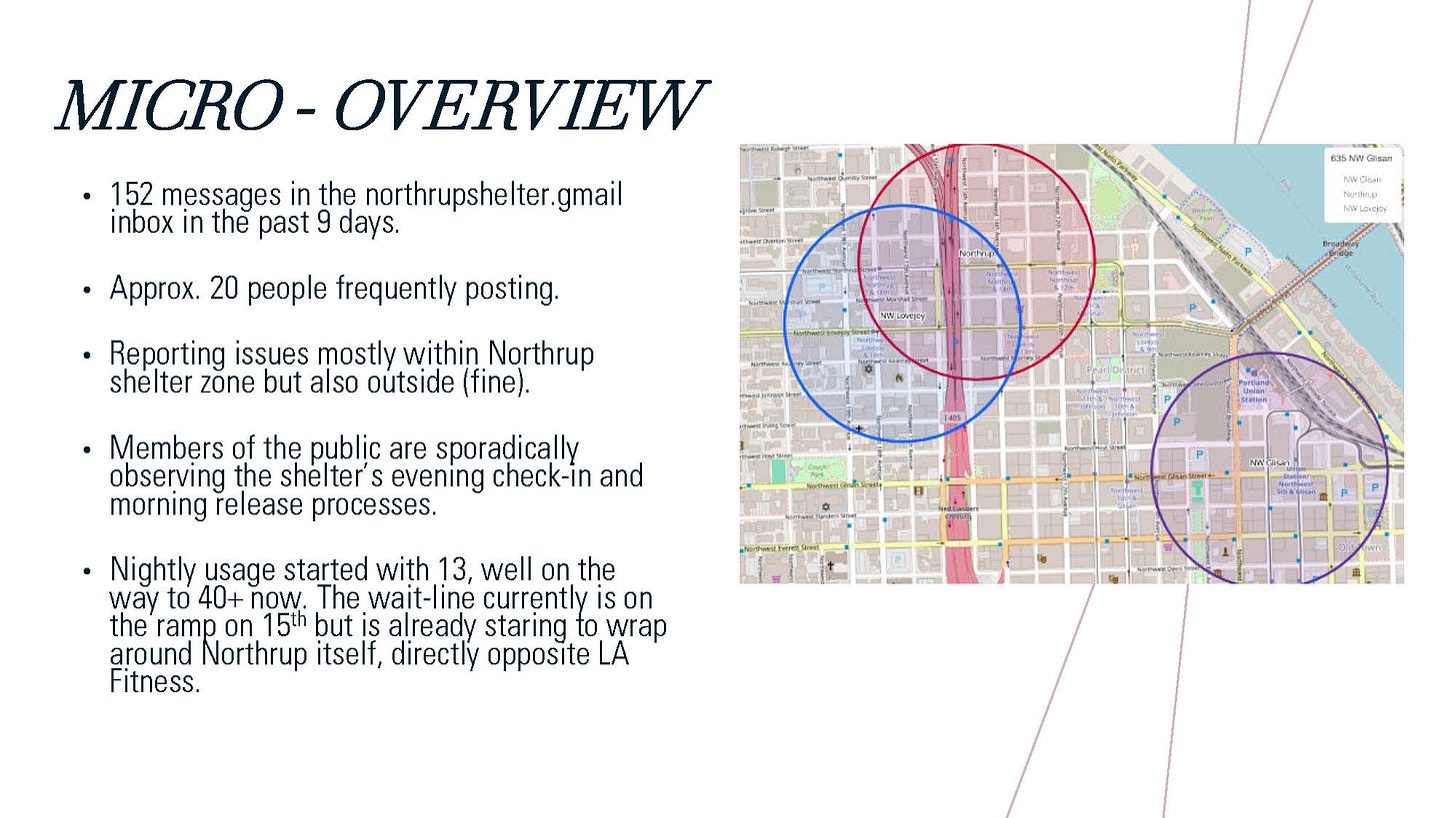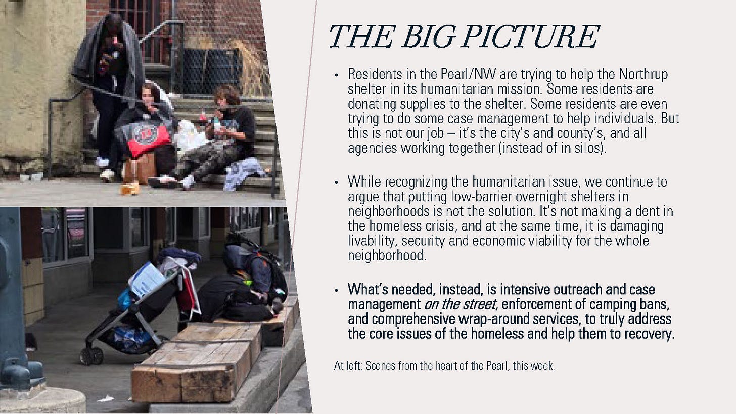 The Pearl District Neighborhood Association Shelter Oversight Committee is paying close attention the Northrup Street Shelter’s impact on the surrounding neighborhood. Last week, Linda Witt and other committee members released this report.