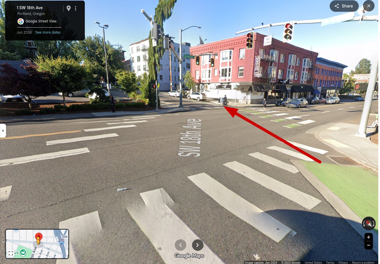 The disjointed intersection forces northbound riders to turn right from Southwest 18th before picking up the bike lane crossing Burnside. The motorist thought Slevin-Vegdahl had turned right onto Burnside (which technically he was forced to do to reach the Burnside crossing) and therefore felt it was safe to also turn right onto Burnside.