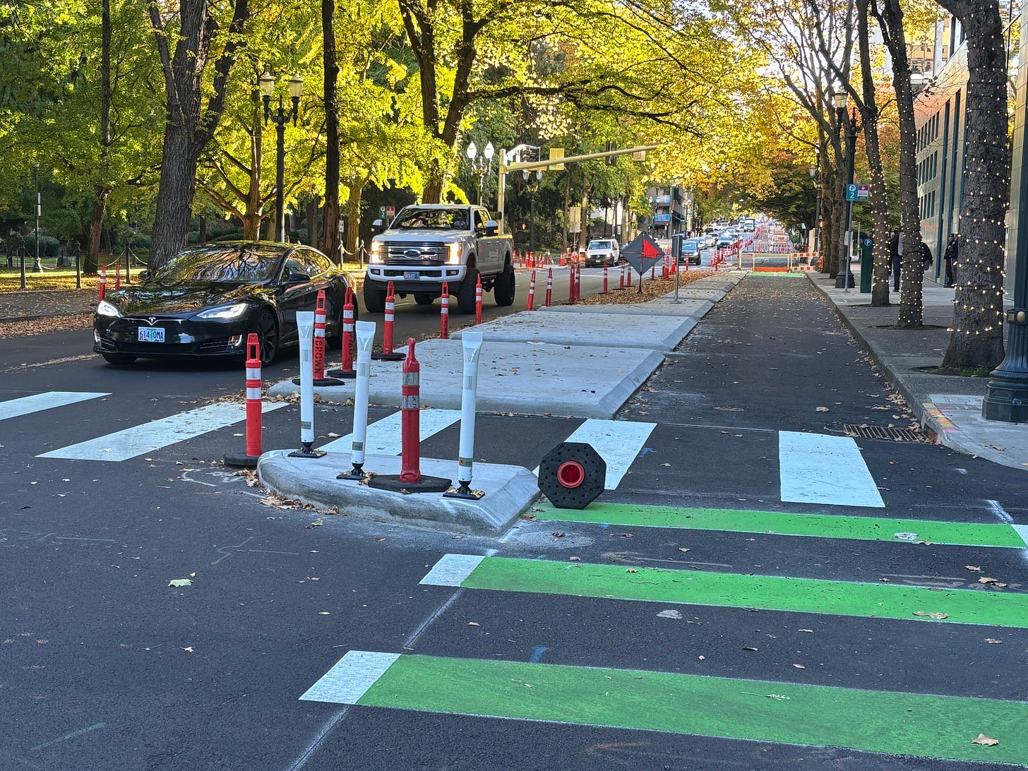 The SW Fourth Avenue Improvement Project, approaching two years in construction, has several goals, but the thing turning heads is the extremely large curb sections to protect pedestrians, cyclists and transit users.