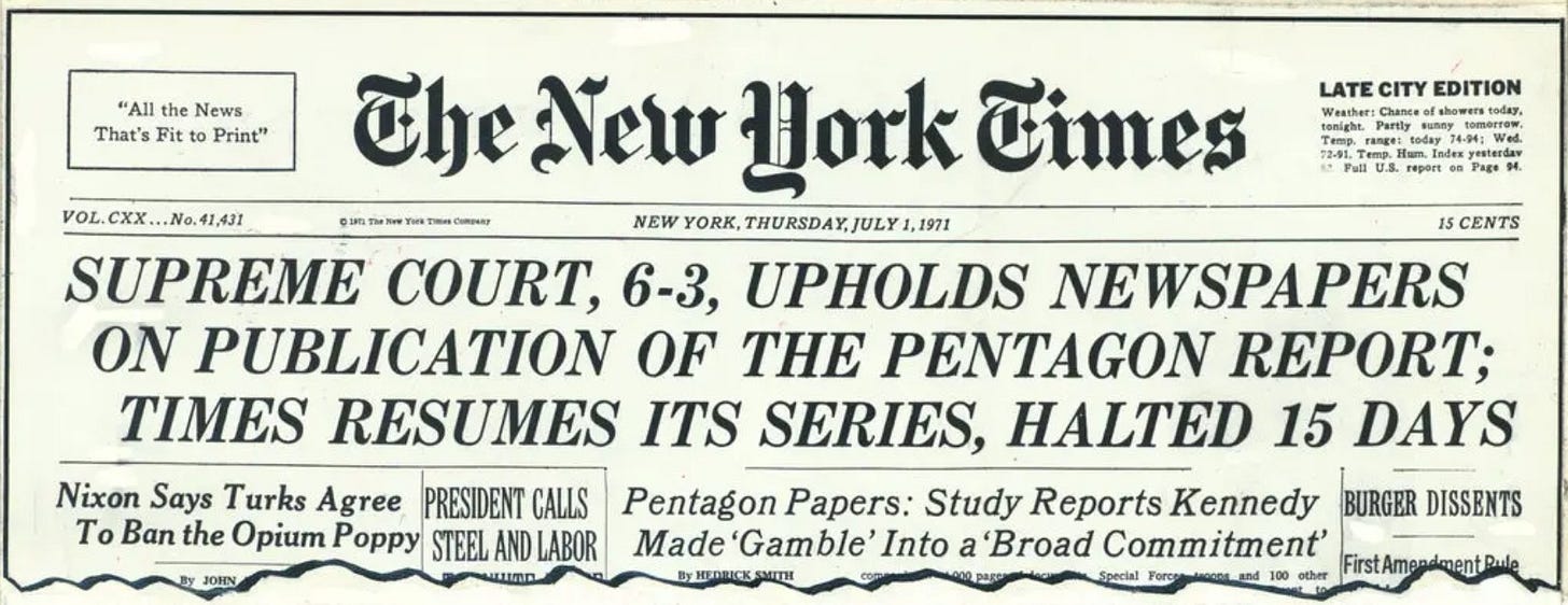 And there were disagreements among Times lawyers and editors on whether the paper could even legally publish the articles. The Times did publish its first installment on June 13, 1971. Within days, the Nixon administration sued to stop further publication, citing national security. The U.S. Supreme Court ruled for the Times, and the case is still considered a landmark legal battle establishing freedom of the press under the First Amendment to the U.S. Constitution.