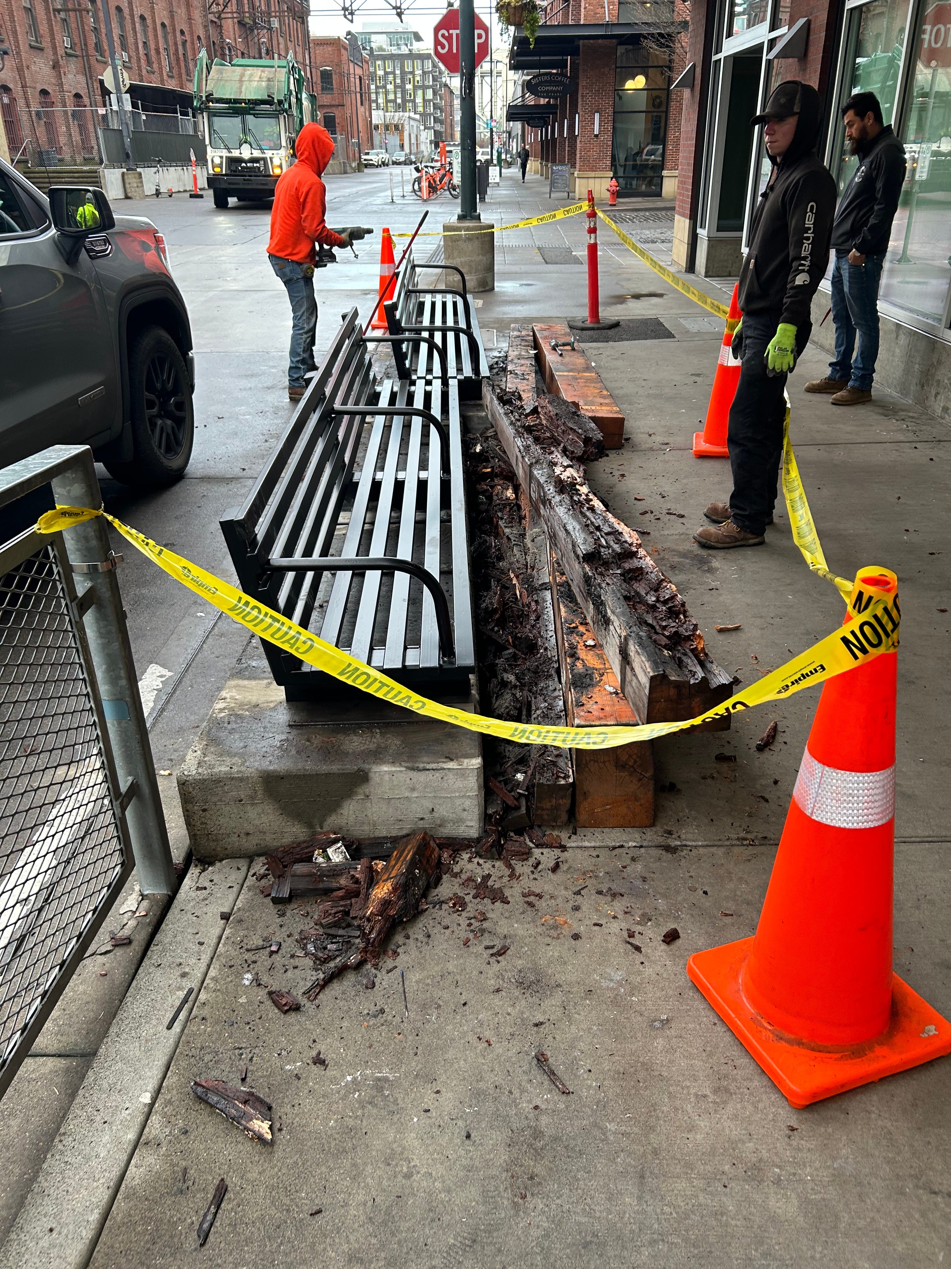After the bench was burnt to a crisp, it was replaced by an indestructible-looking metal bench and anchored to the same spot.