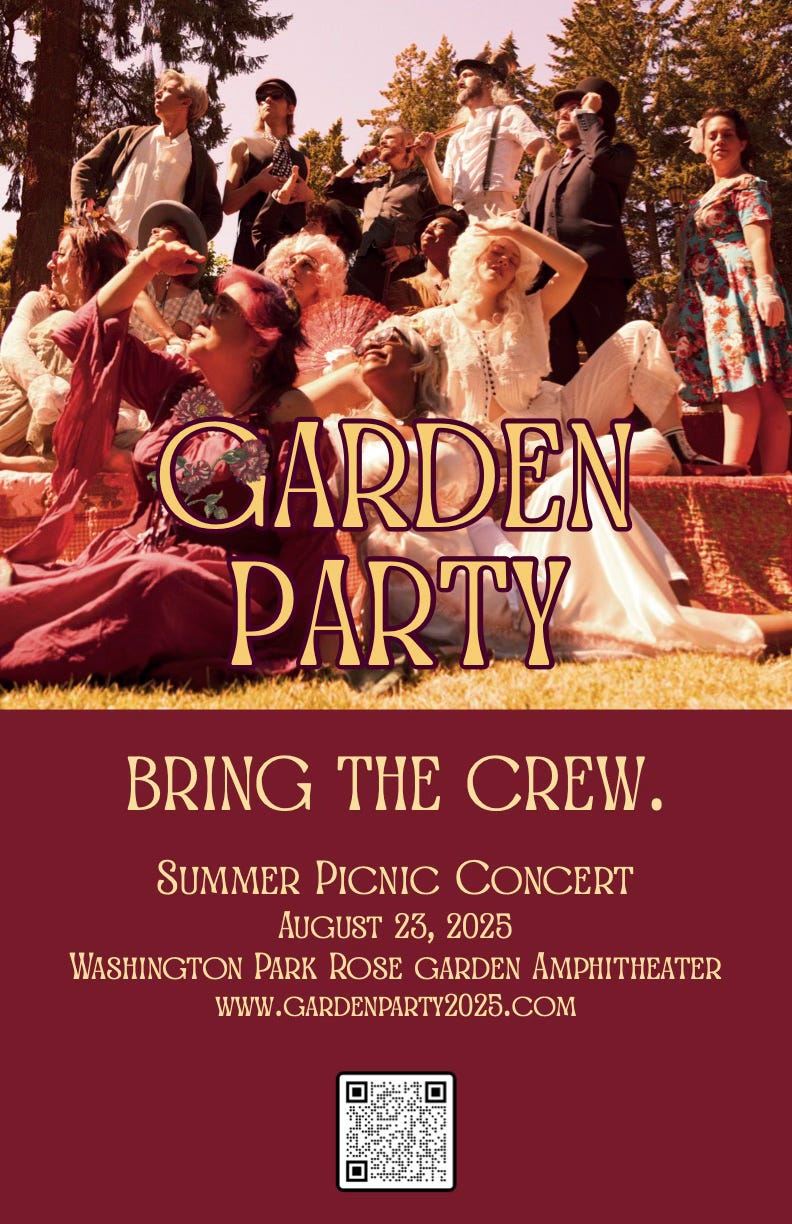 To bring people together in a joyful, whimsical way. That’s the goal of the people behind a glam-folk concert planned for Saturday at Washington Park Amphitheater. Called Garden Party, the event is produced by Northwest Portland musicians Lindsey and Jordan Plotner (Ned and Wendy the Band) and producer/musician Christopher Jack. Garden Party dress is encouraged.