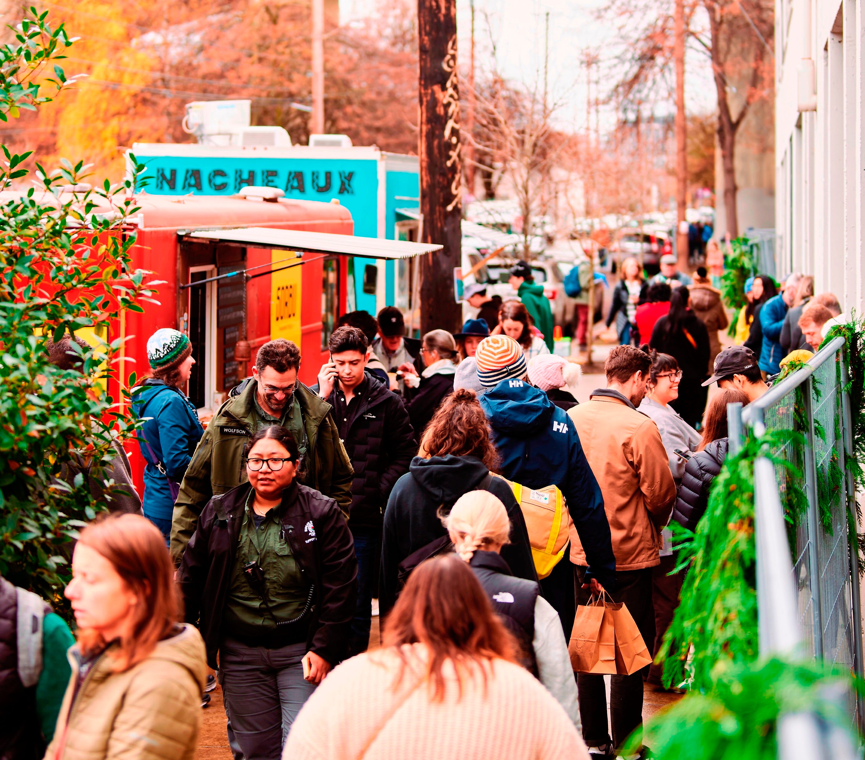 The street in front of the main entrance is closed to cars this year. There’s a coffee cart, dumpling cart and a chai truck instead. Needing gallons of coffee after working long holiday hours, I headed inside, where a cute little trailer stocked with Portland’s Straightaway canned cocktails greeted me.