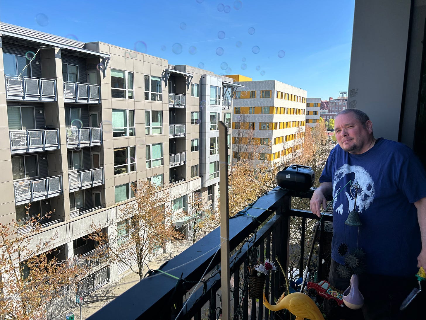 Since 2018, Ty Young and his wife, Silver, have lived here in a fifth-floor unit at the Pearl’s Lovejoy Station Apartments. Their cozy flat is filled with personal touches, like flower boxes, jigsaw puzzles and plastic flamingos. A bubble machine mounted on a patio railing “sends something good into the world,” Young said.