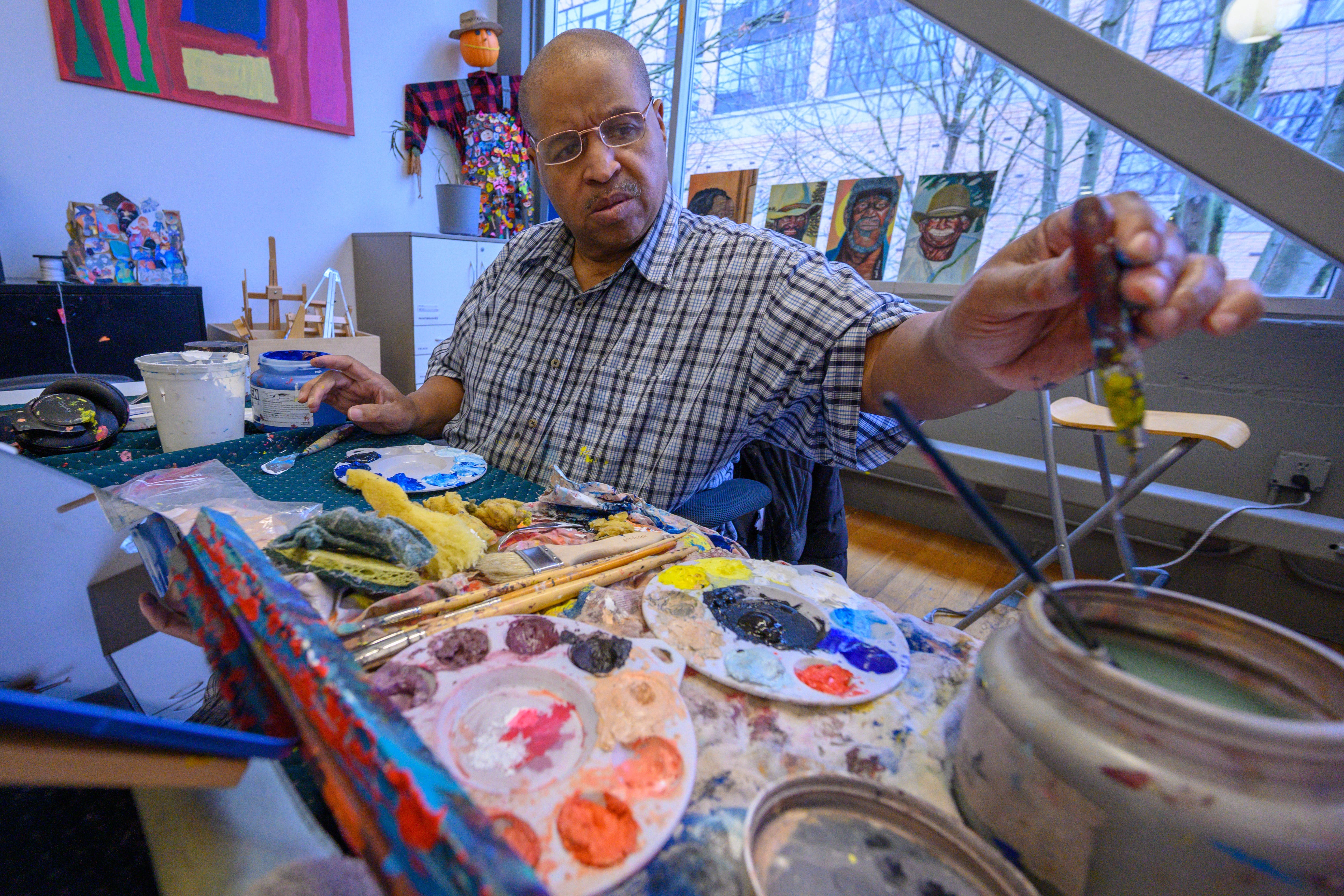 We met Bishop at North Pole Studio in the Pearl District, where twice a week he goes to work on his paintings. The 5,000 square-foot studio space is specially designed for neurodivergent artists — artists with autism and intellectual/developmental disabilities, some of whom have unique sensory needs. North Pole Studio is one of roughly 100 “progressive” studios across the United States.