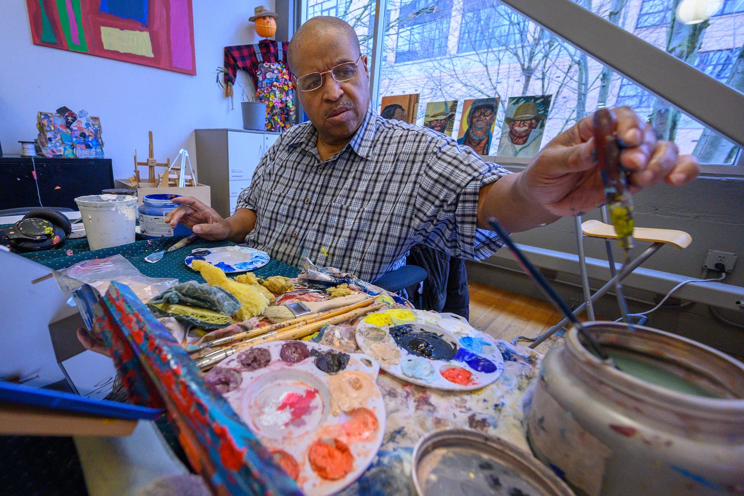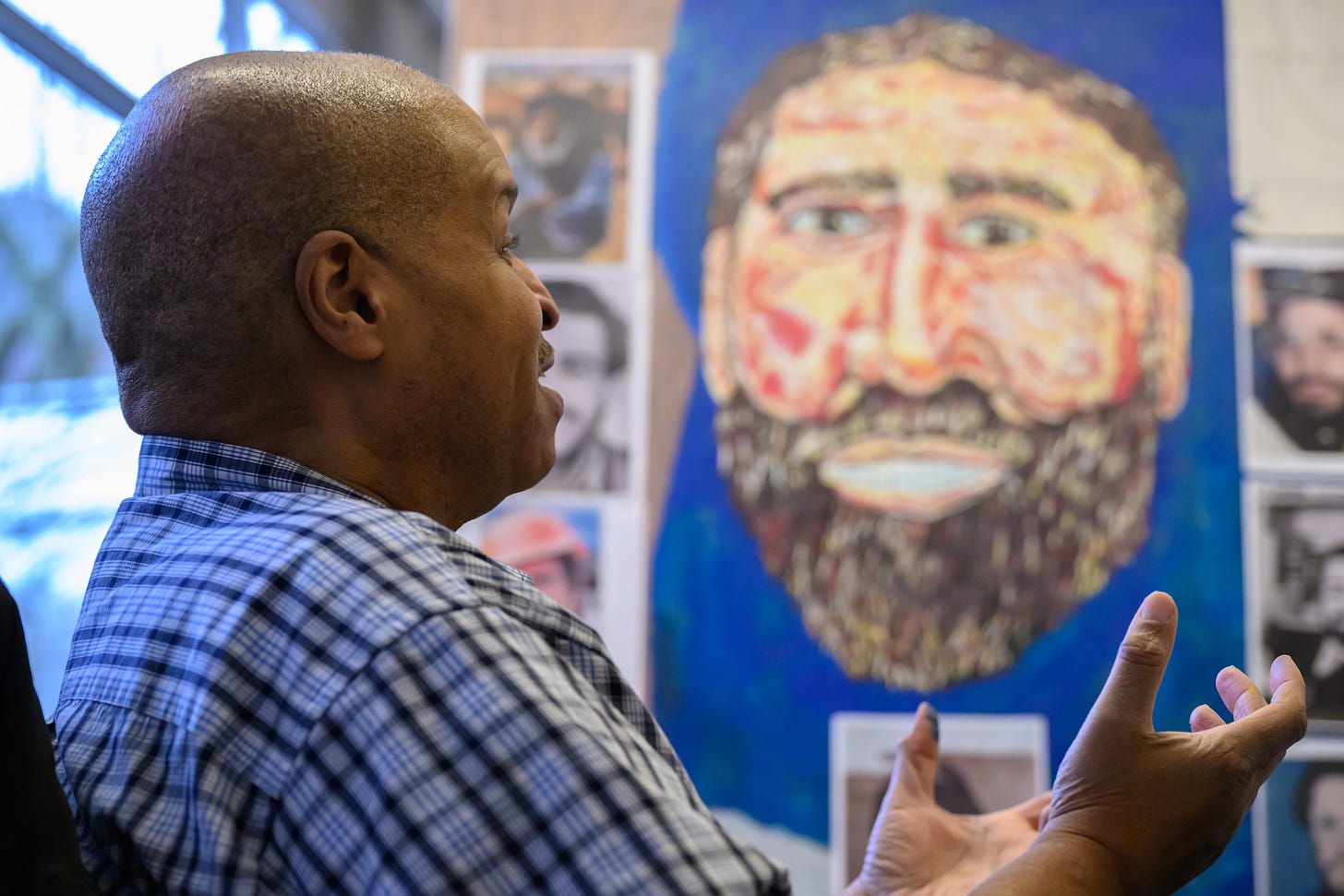 Bishop is a Seventh-day Adventist. He says that Jesus Christ motivates him to paint. “I work to do what he wants me to do.... He opens your eyes to what he is trying to say and you sit there and go, oh ok.” And then Bishop says he paints. When we met Bishop, he was working on a painting of Jesus. Like Bishop’s other work, Christ’s vivid face is a result of repeated layering of multiple colors, dark to light. Acrylic on canvas. There is a tactile presence in all his paintings. Wrinkles and facial lines wear well on Bishop’s people. In the age of Instagram, that alone is profound.