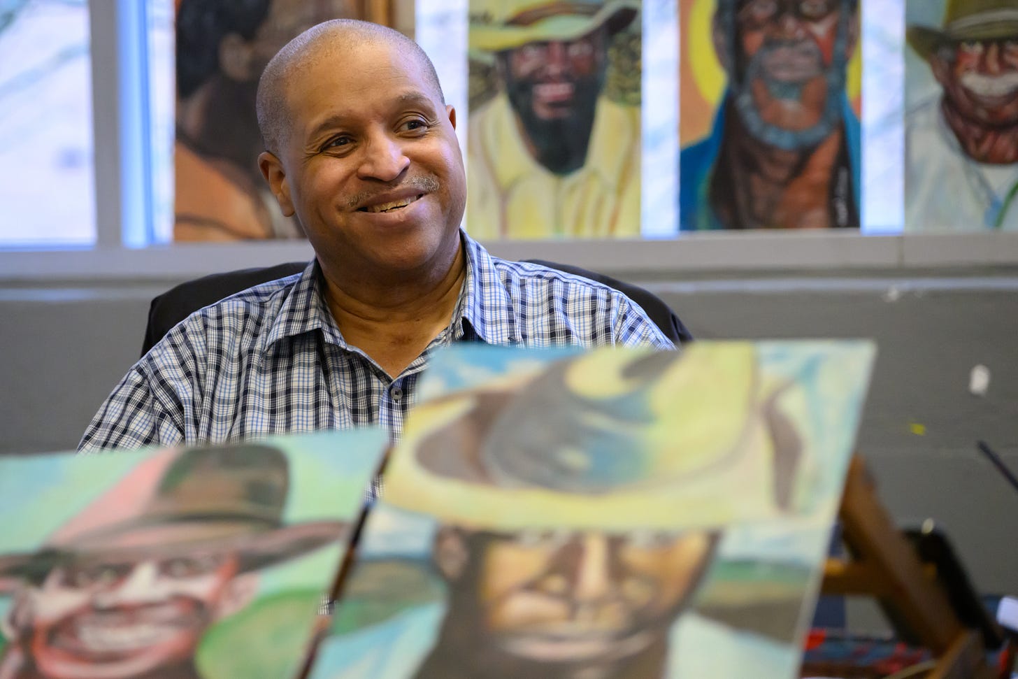 Last year, North Pole Studio’s represented work at the Outsider Art Fair nearly sold out. This year will be the first time Bishop’s work will be shown there. Seven of his paintings will be for sale, mostly from his series on Black cowboys. Bishop’s concentration on faces means when we stare at his cowboys, we see their muscularity, their intensity. Bishop says they are thinking about their life on the range and that they are very proud of their work. That’s not something we see a lot in city museums.