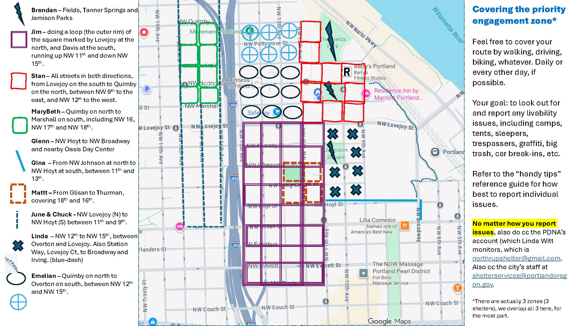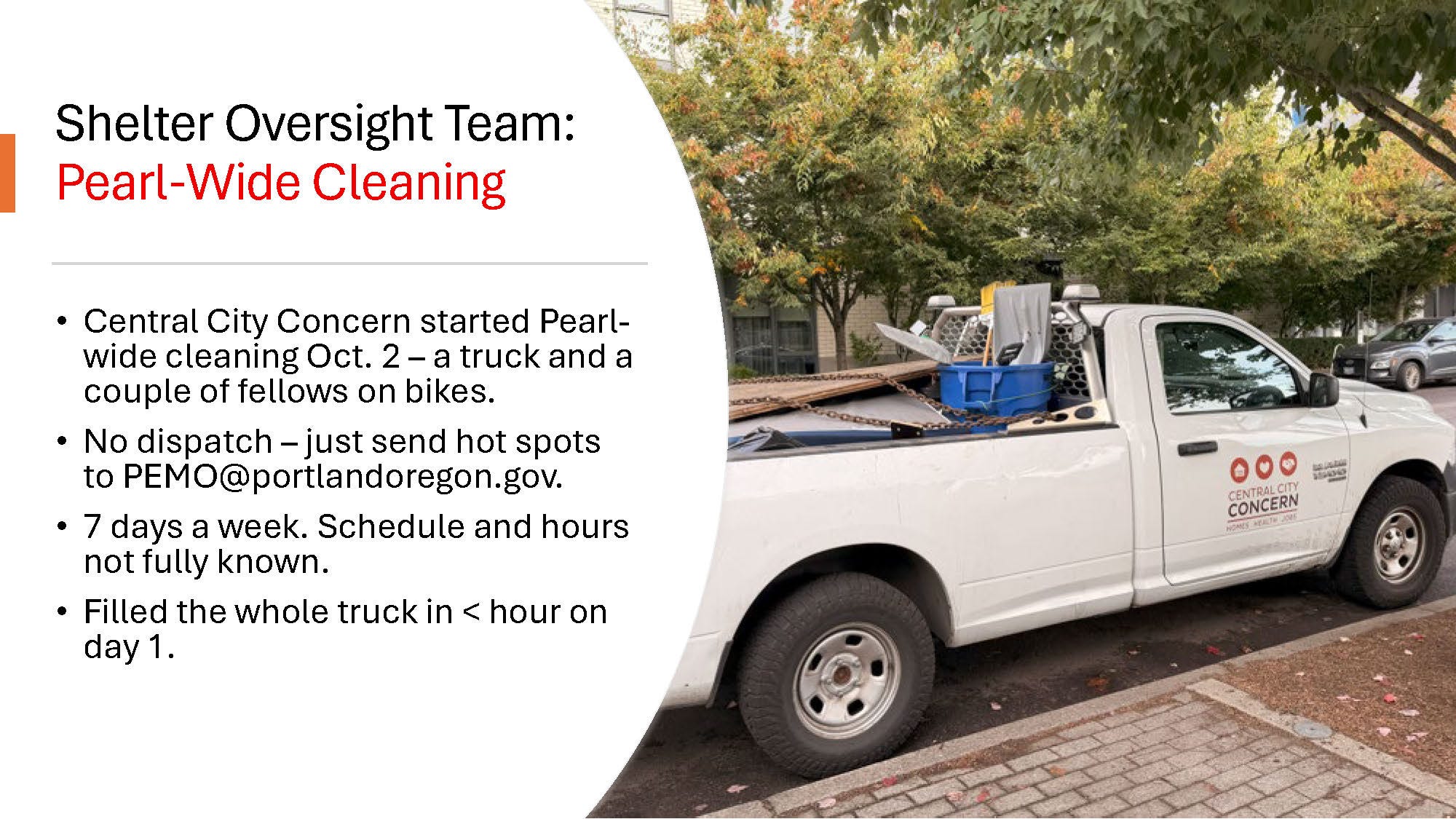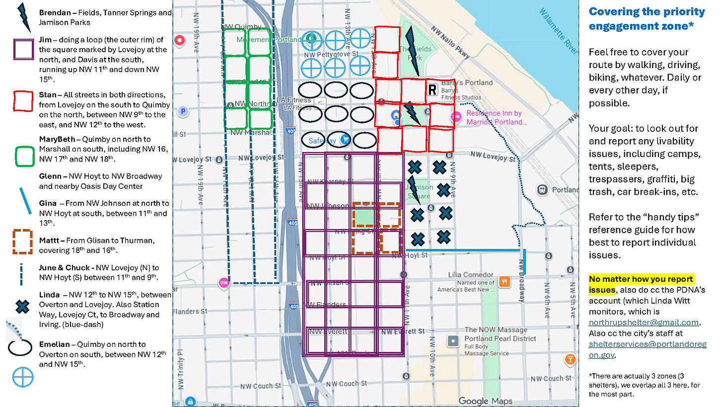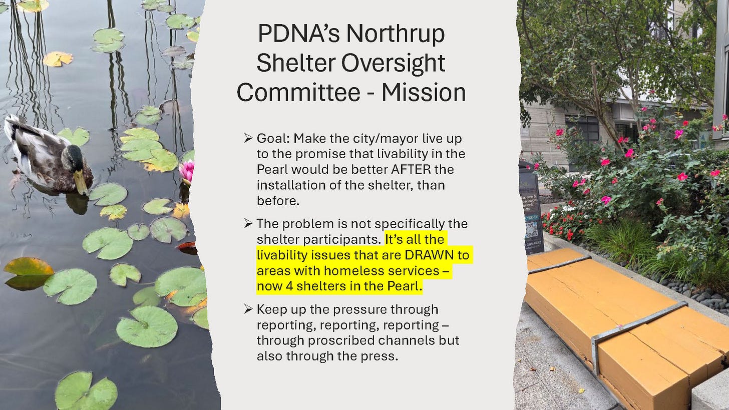 The Shelter Oversight Committee of the Pearl District Neighborhood issued a new report, the second covering the first six weeks of operation at the Northrup Street Shelter. The committee, chaired by Linda Witt, includes about 10 neighbors who daily monitor conditions in their sections of the district.