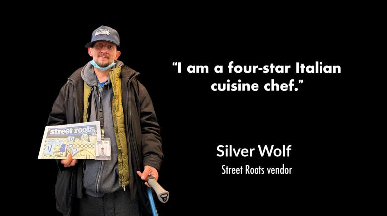 You can find Silver Wolf selling newspapers any day of the week outside of Rocket Fizz on Southwest Sixth Avenue. You can also tip him via @StreetRoots Venmo, by entering his name and badge number (1031) in the memo.