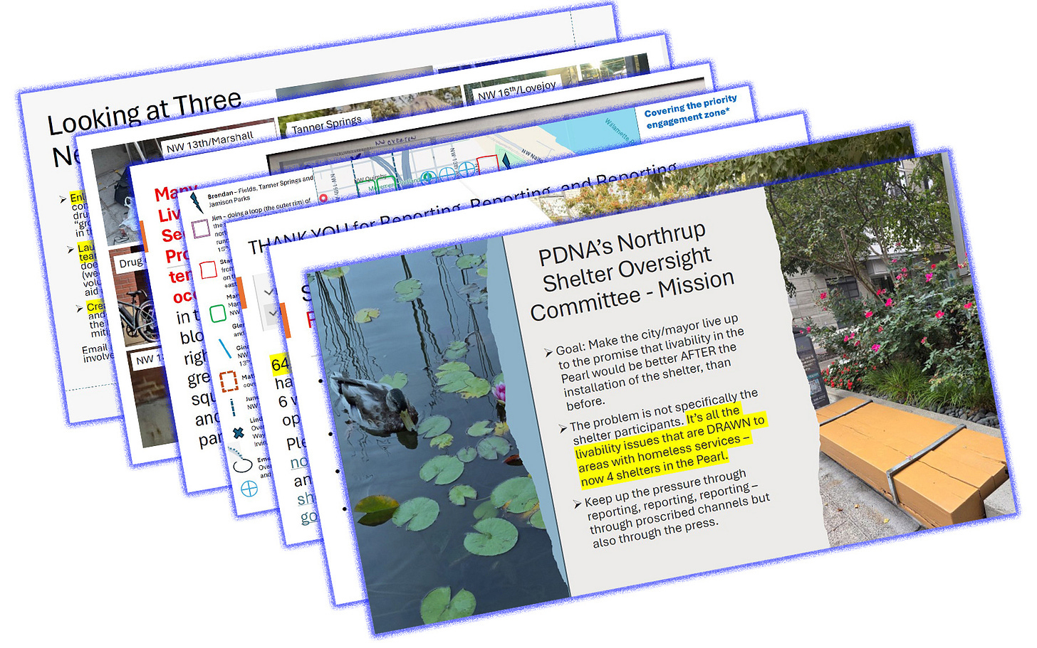 Grateful for the Pearl District Neighborhood Association, Linda Witt and volunteers for their informative work! Our Pearl and NW neighborhoods are lucky to have this crew reporting on the dire livability issues plaguing our neighborhoods due to the low barrier overnight shelters. See something, say something! We all need to keep reporting!