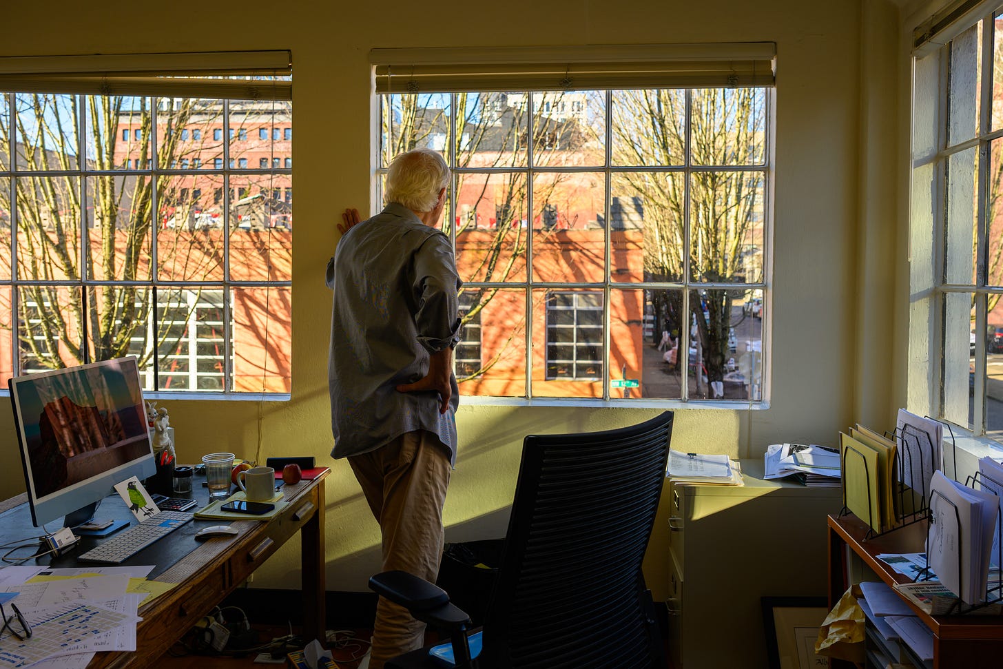 Today, lean and lanky in his signature Patagonia vest and untucked oxford, he looks out his office window on Northwest 12th and Hoyt and sees signs of revival.