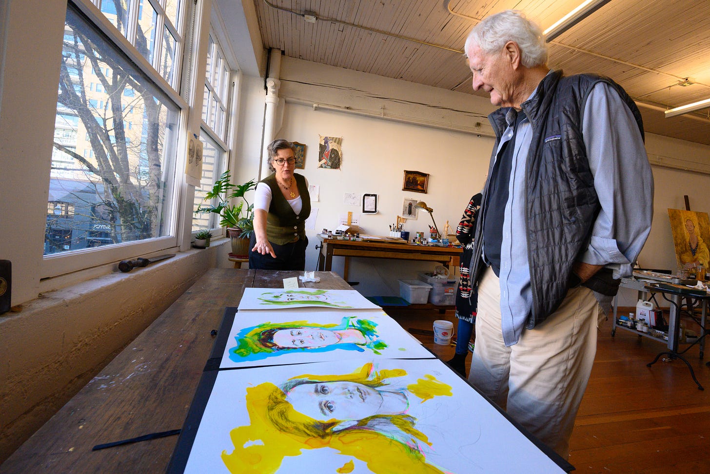 “It’s a fantastic old bricker, with a big, industrial elevator, wood floors and ceilings, huge timber beams from a different era of construction,” said Arend, who now enjoys evolving her new expressionistic painting style, “Splash Portraiture,” in what she describes as “the Rembrandt-like light through the old pane windows.”