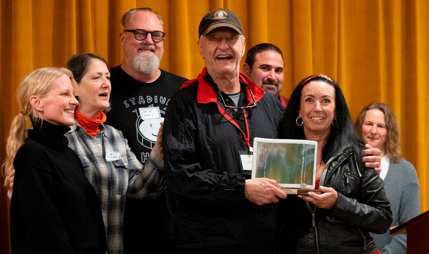 Stadiumhood Neighbors, including Pete Colt (center), who also received the Defender of the Realm award, were recognized Saturday night for their work on behalf of the neighborhoods around Providence Park. Michelle Milla (L-R), Janet Parker, Dave Gray, Colt, Bruce Chirre, Karen Chirre and Britta Diettrich.