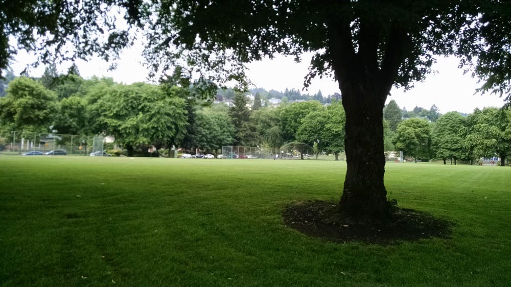 Rosie and I are partial to two north-facing benches fixed to a concrete pad on the park’s south side, just off Pettygrove. They’re the equivalent of “lower bowl” seating on the 50 yard line at a football or soccer game, offering their occupants a panoramic view of the park’s entirety under an impermeable canopy of conjoined overstories from a massive American elm and a couple of Douglas firs. The best seats in the house, in my opinion. You’re apt to find us there, rain or shine, two or three times a week in the mid-afternoon.