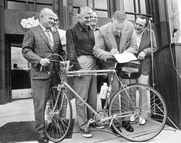 He pioneered Oregon’s bike movement, founding the Bike Lobby in 1967 and leading a campaign for passage of the 1971 Bike Bill that was commemorated by a photo of him with Gov. Tom McCall at the state capitol.