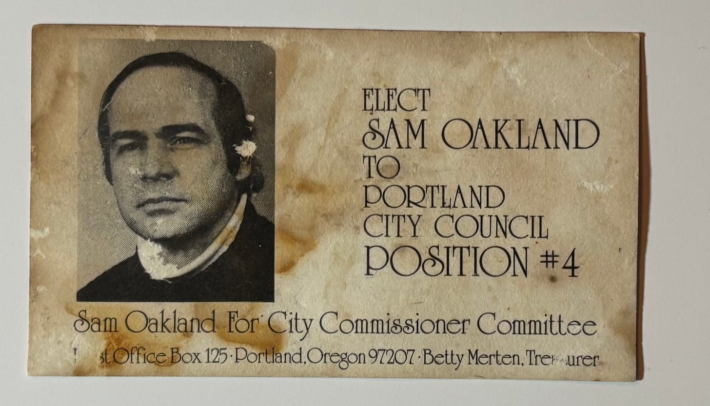 The humble card had served as a campaign flyer for Sam Oakland, a City Council candidate in 1974. She had met Oakland somewhat later when he was working in a lawnmower shop, and they discovered some common connections, including her fascination with his “crazy, overgrown garage” on Northwest Thurman Street that was akin to a local landmark.