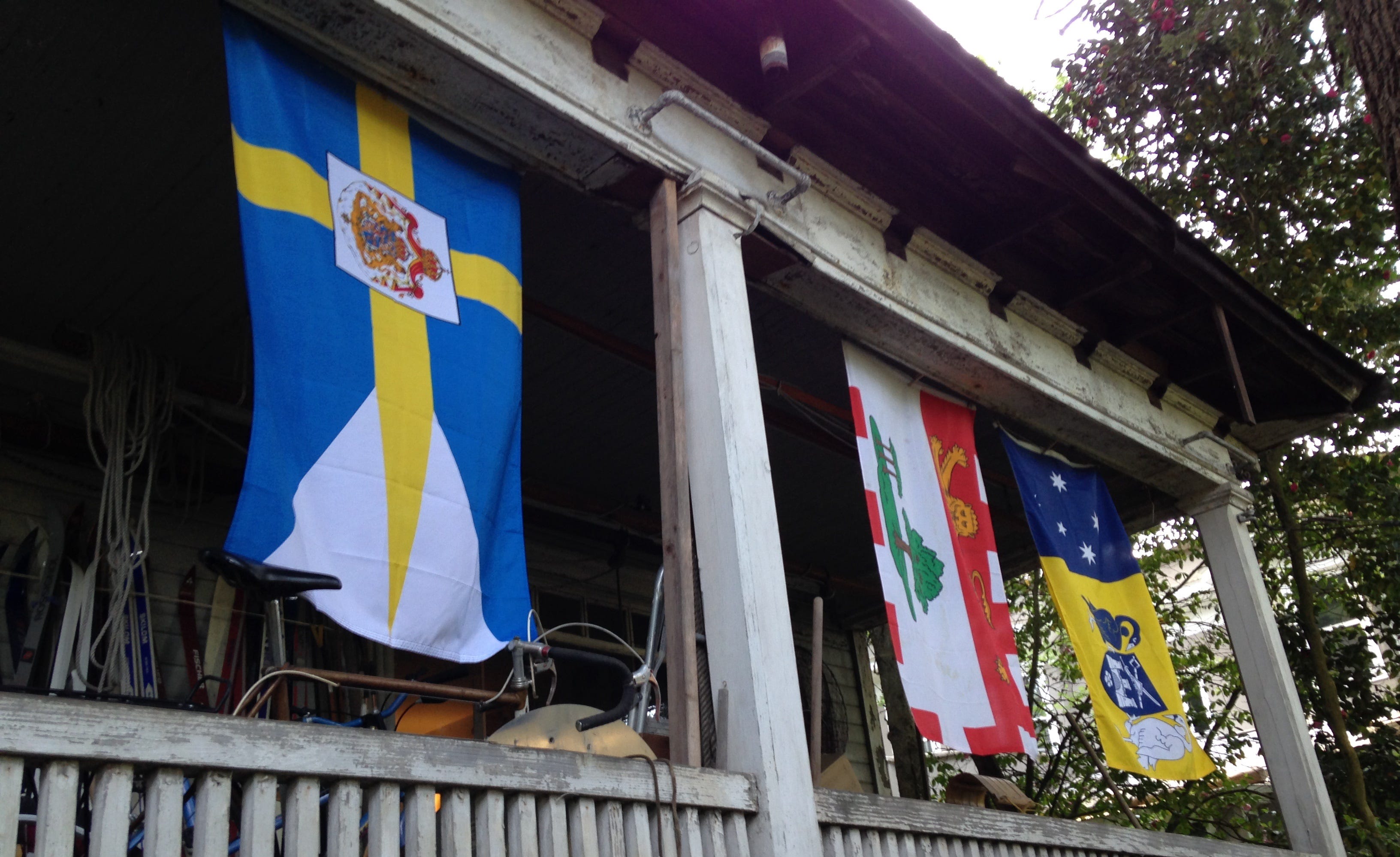 International flags adorned the world traveler’s porch.