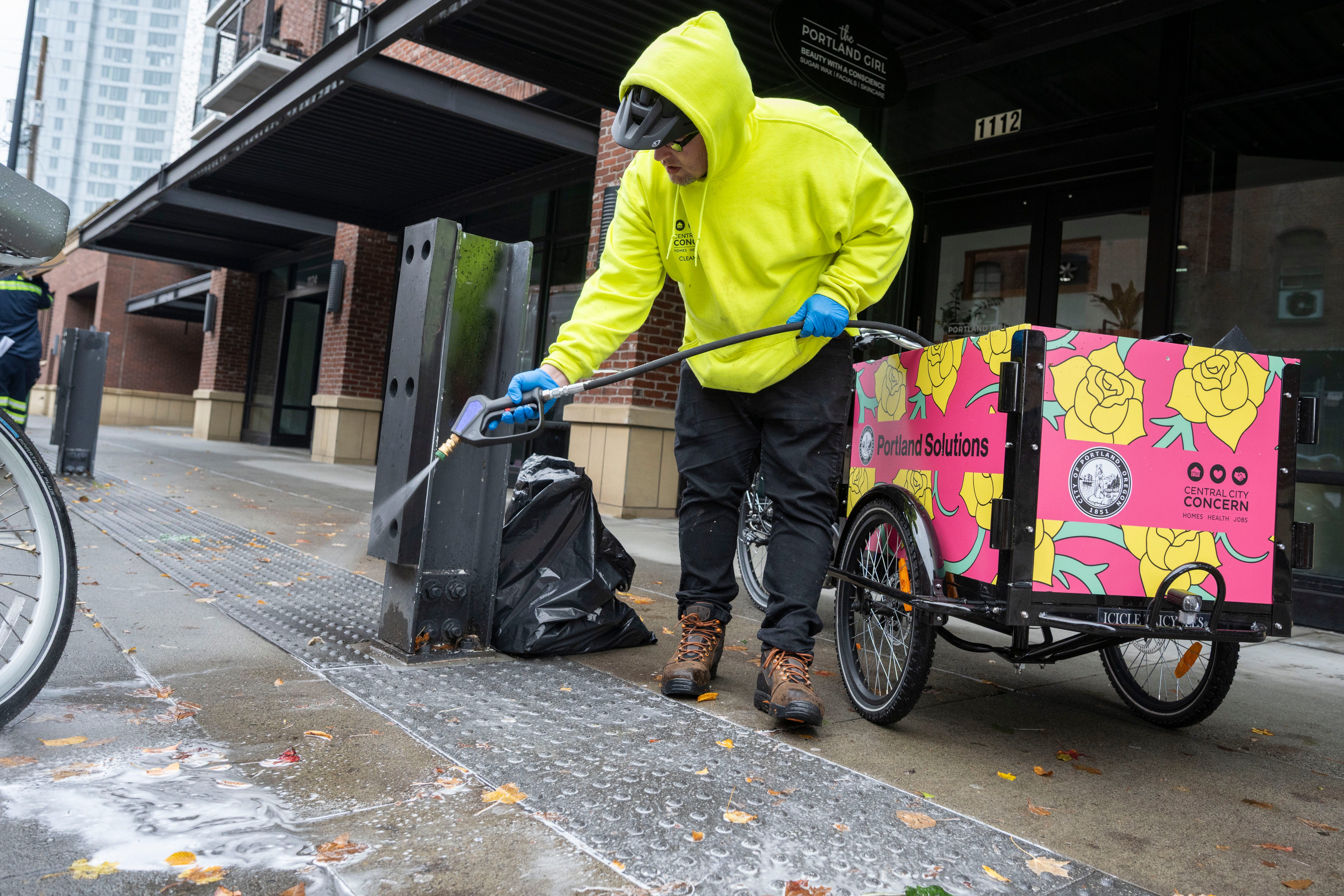 People on tricycles are cleaning up the Pearl District and beyond, a special city effort to mitigate impacts related to three facilities for the homeless in the district. Pedal-powered vehicles have been making the rounds every morning since the beginning of October, picking up trash as well as biohazards, such as needles.