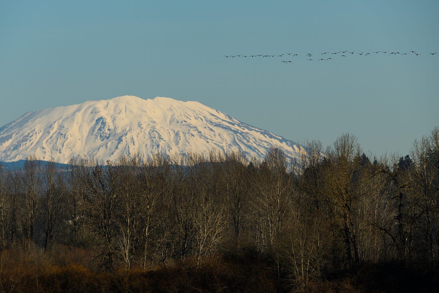 Some of the very best Portland-area views of the Mount St. Helens volcano are from Sauvie Island. From the spot where I took this photo (GPS N 45.7784983, W 122.7788133), the distance to the south rim of Mt. St. Helens is 40.1 air miles. By comparison, the air distance to the volcano from Portland’s Council Crest Park is 53.8 miles. So from Sauvie Island, you’re nearly 35% closer to the mountain’s 8,363 foot summit than you are in town. And in crystal-clear winter skies, from Sauvie Island you often can score a few bonus-volcanoes: Mount Ranier (14,411 feet) to the north; Mount Adams (12,280 feet) farther to the east; Mount Hood of course (11,249 feet); and way to the south, Mount Jefferson (10,497 feet).