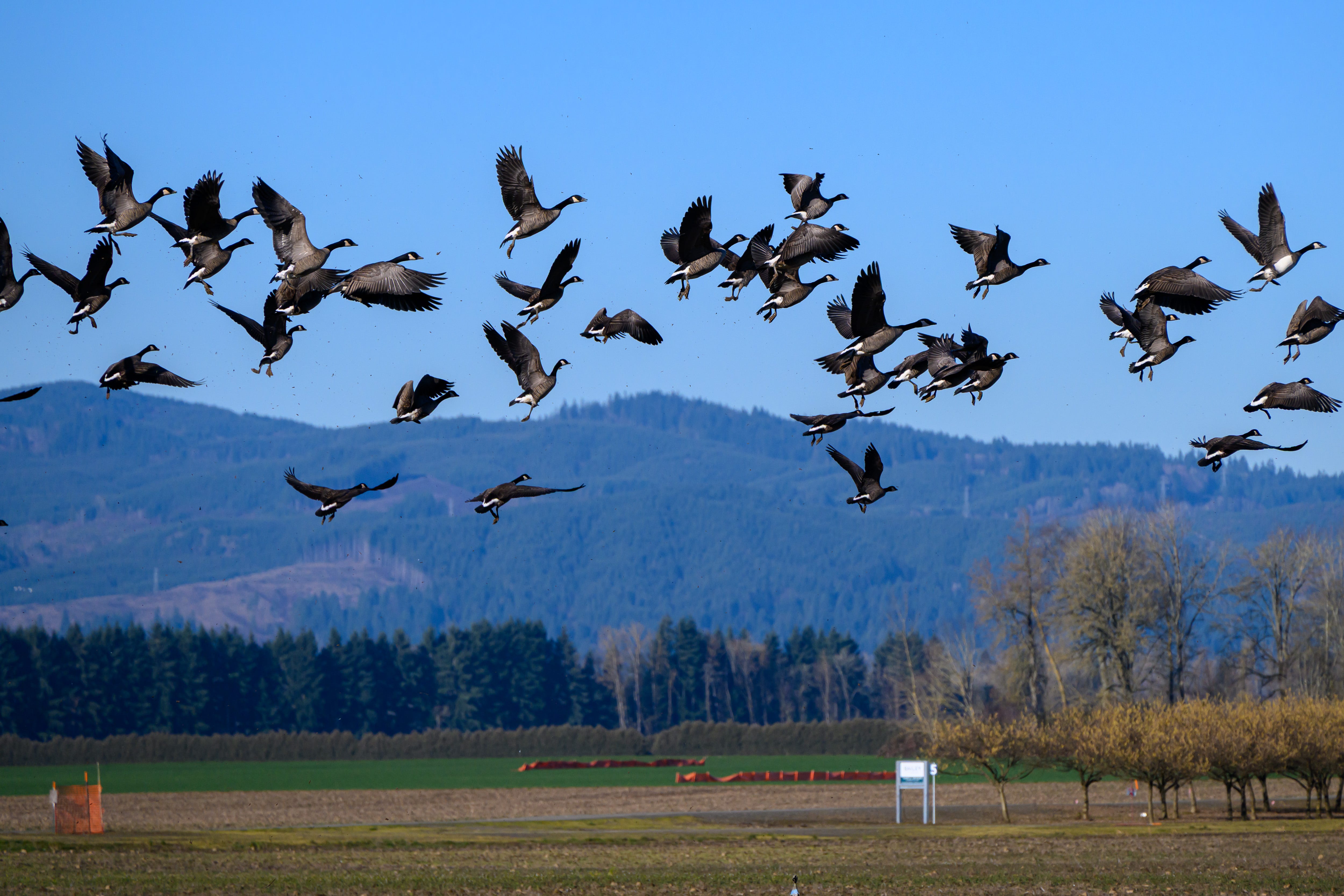 The soil on Sauvie Island, having been deposited over millions of years by countless Willamette and Columbia River floods, is famously fertile. (See pumpkins, Sauvie Island.) Even when nothing much is sprouting during the winter, there’s some amusing proof of the great soil here. I discovered this when I photographed this flock of Canada geese taking off from a muddy field. One indicator of soil richness is how sticky it is. (Sticky soil has clay in it, which helps it hold nutrients and water.) What did I spot in this flock? Up close, if you click to enlarge the photograph, you’ll see hundreds of flecks of persistent airborne mud, plummeting back to earth off our geese’s little yellow webbed feet. The Sauvie soil is that good — the stuff is that sticky.