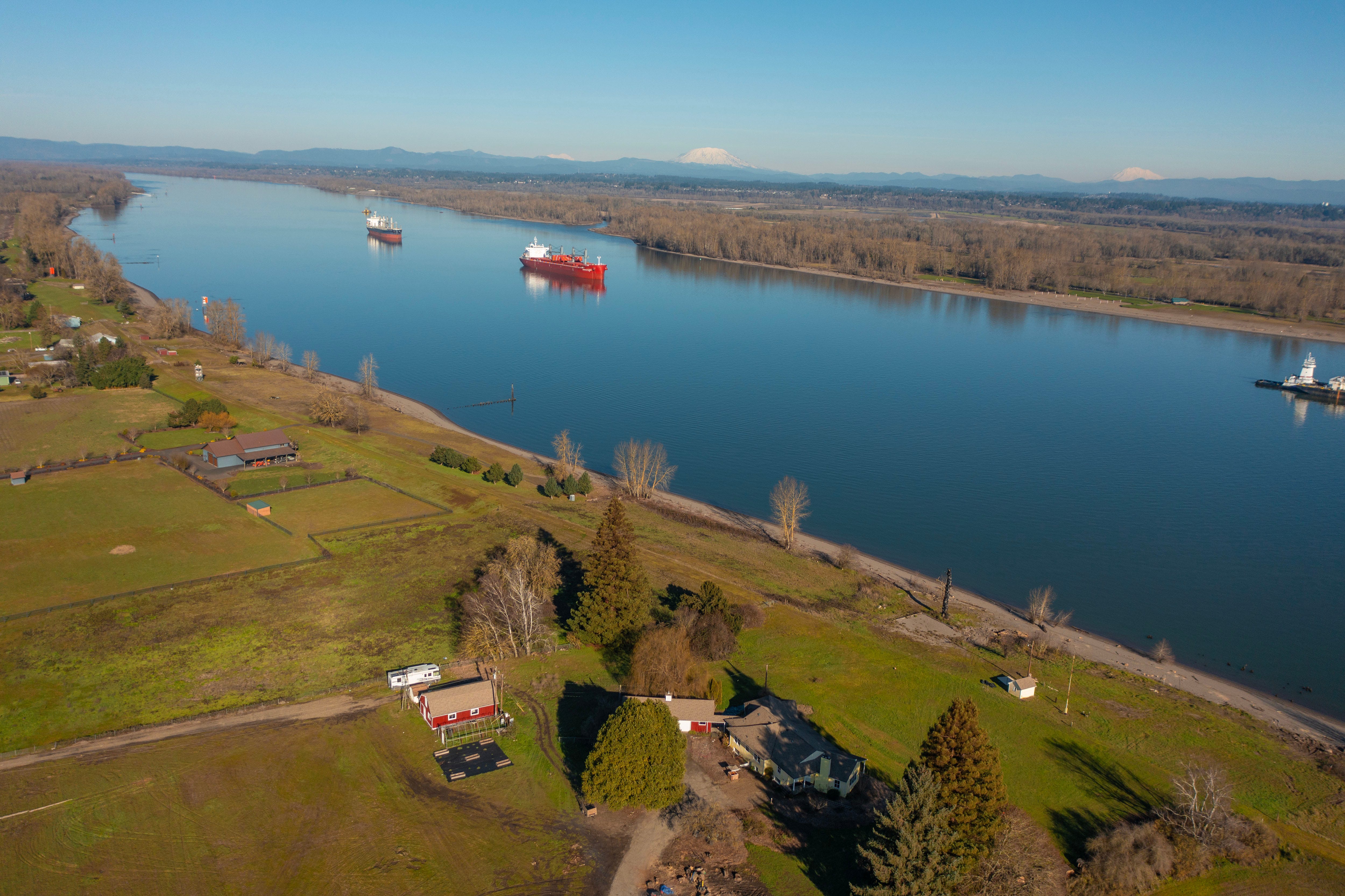 Let’s orient ourselves. Below my drone, that’s the main stem of the Columbia River, which flows roughly west through the Columbia Gorge and past Portland but then whips directly north at Sauvie Island, which is in the foreground. During the winter, when the riverbank’s deciduous trees are bare, you can see massive cargo, container, tanker and vehicle carrier ships sailing between the Port of Portland — 10 to 20 vessels a day — and ports generally in China, South Korea and Japan. These ships feel surprisingly close when you’re down on a Sauvie Island beach.
